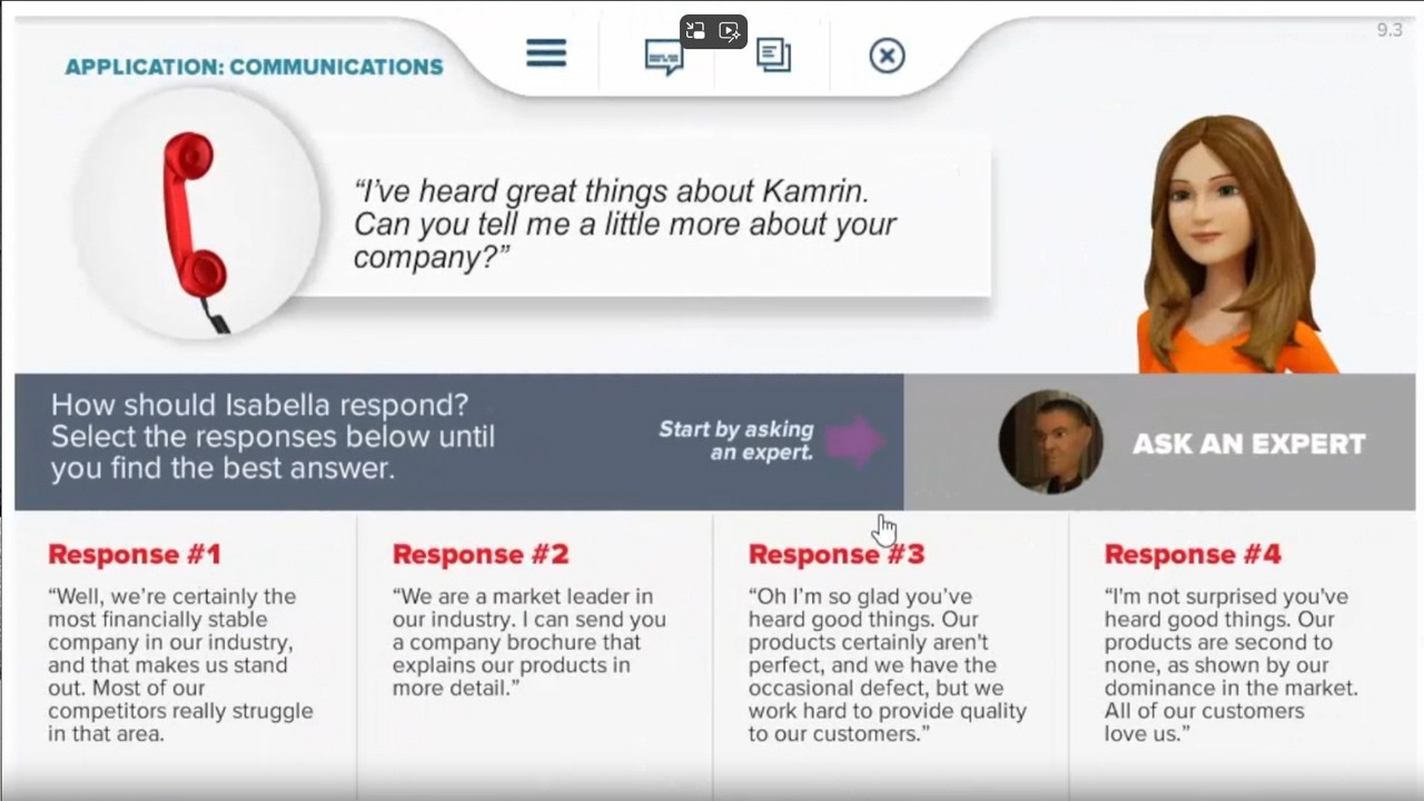 “This game challenges learners to build their skills and confidence. The first scenarios allow use of job aids. After successful performance with aids, timing is introduced followed by the removal of job aids and addition of challenges for faster performance and handling increased complexity.” Allen Interactions Inc.
