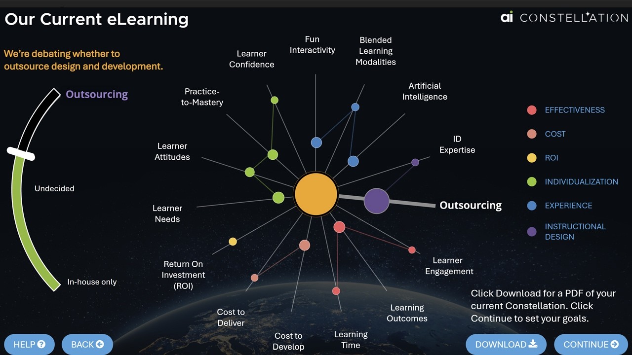 “In a program we created, students are initially asked about their strengths, weaknesses, and aspirations as instructional designers through an infographic-building interface called the Constellation. A unique collection of resources and instruction tailored to specific learner characteristics along with ways to measure their success. ” Allen Interactions Inc.