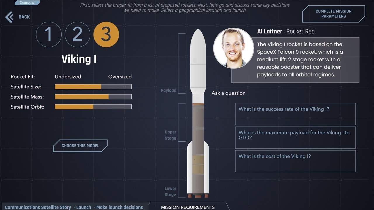 “This Nova Space example asks learners to launch a satellite into orbit. Using the specially built simulation, learners experiment with making critical decisions regarding geographical launch locations to selecting an appropriate rocket and load.” Allen Interactions Inc.
